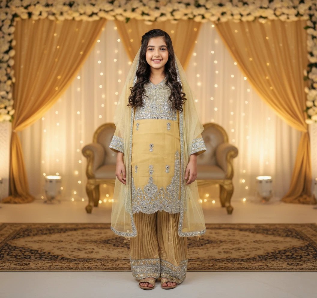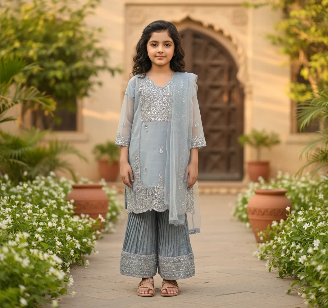 This Organza Full Embroidery Angrakha Girl Suit is a beautifully handcrafted outfit perfect for special occasions like parties, weddings, or formal events.