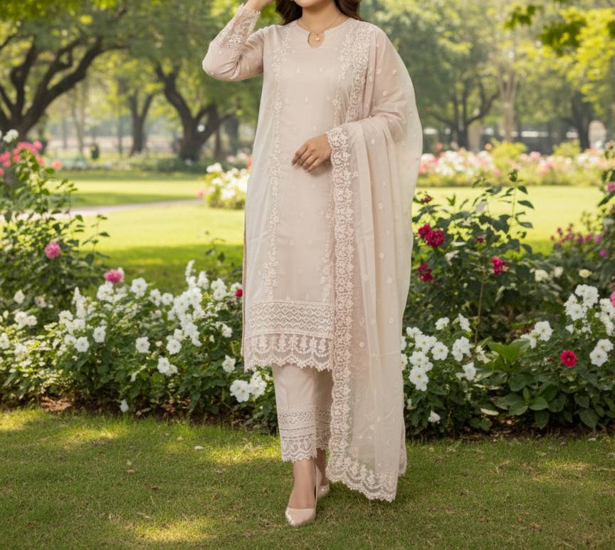 This Pakistani 3-piece suit is perfect for any occasion, from a casual day out to a formal wedding. It features beautiful embroidery work on the sleeves and front, adding a touch of elegance to the outfit. The round neckline and pullover closure make it easy to wear, while the knee-length dress provides a comfortable fit for any body type.